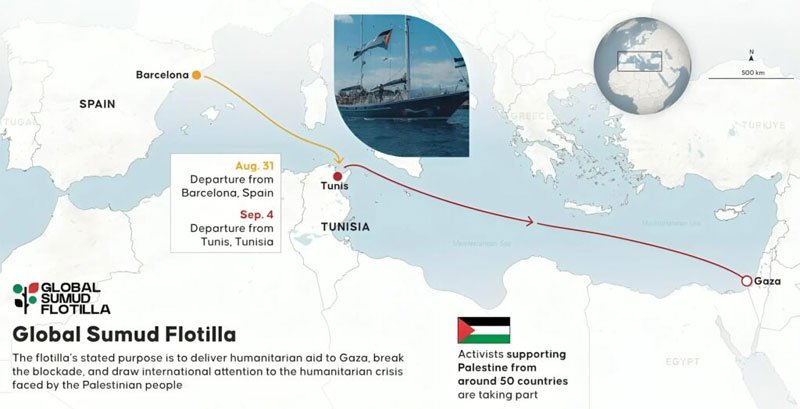 The flotilla began setting sail in late August and early September 2025, with convoys departing from various ports across the Mediterranean, including Barcelona, Genoa, and Tunis. The journey is a high-risk maritime maneuver, especially as the vessels enter the high-risk zone approaching Gaza’s territorial waters.